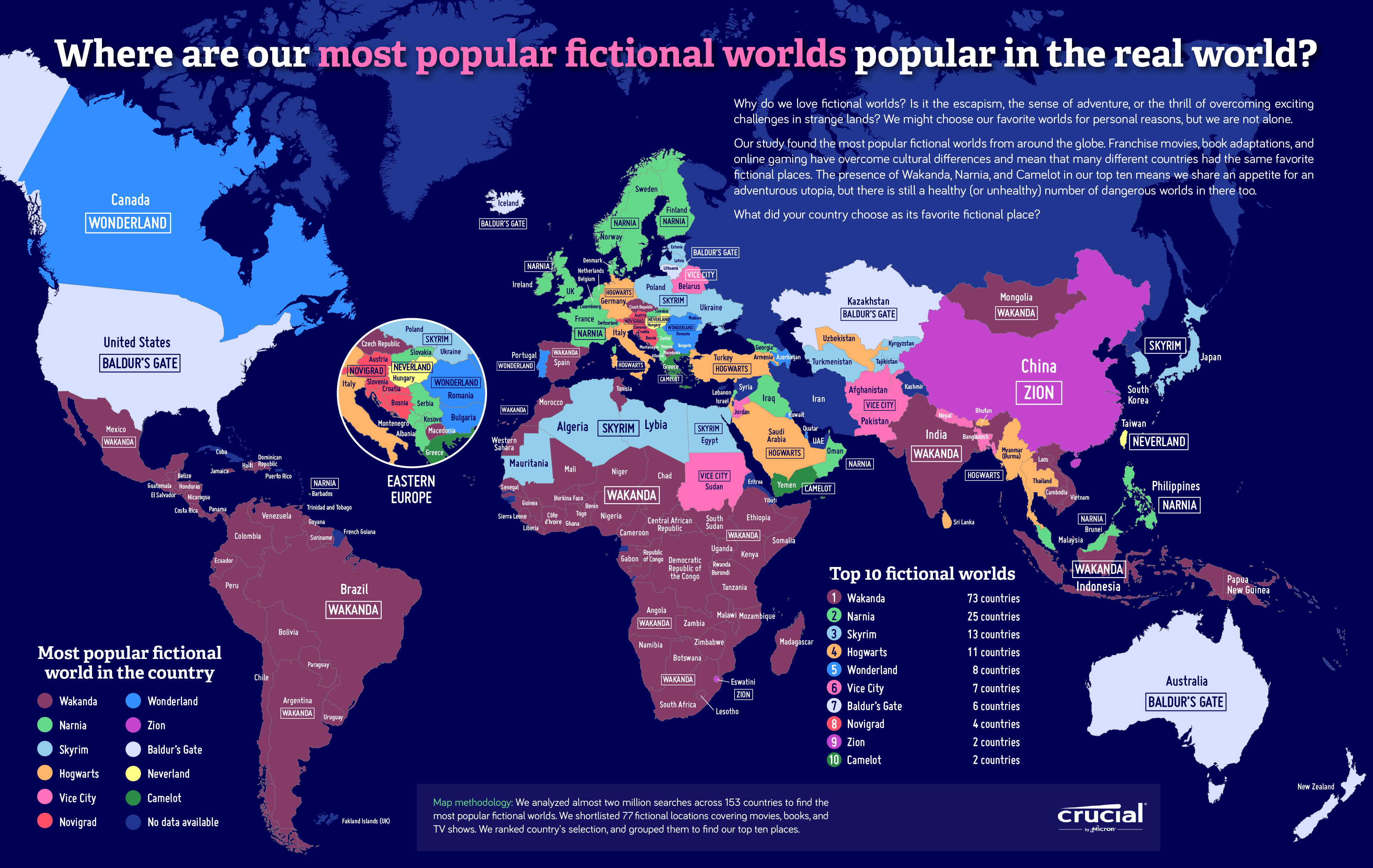 Working on a country-by-country basis, we have calculated the most famous fictional worlds overall. This ignored whether they were books, movies, or games; we simply wanted to know which imaginary place was the most popular in each country.
